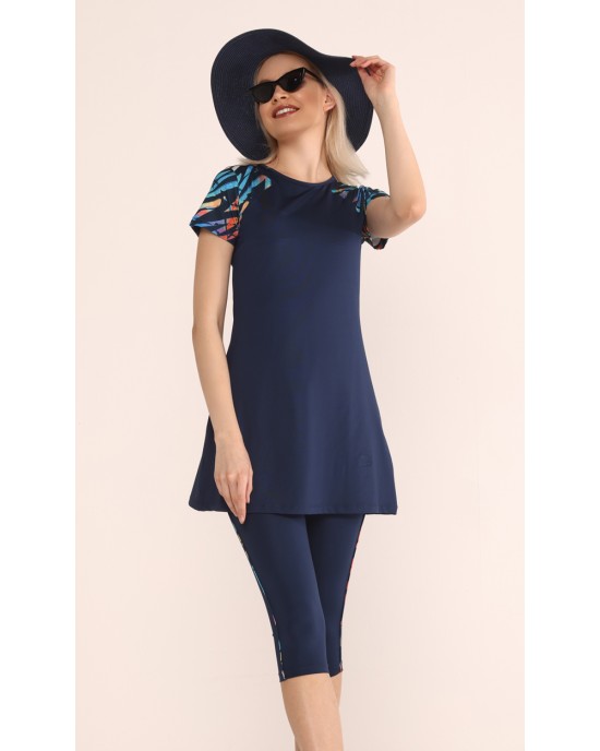 0446 Büyük Beden Kısa Kollu Yarım Kapalı Taytlı Mayo K.Lacivert nurkonicgiyim